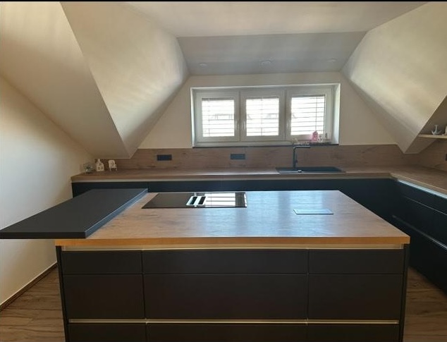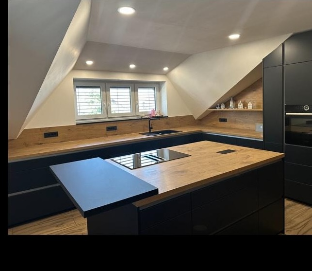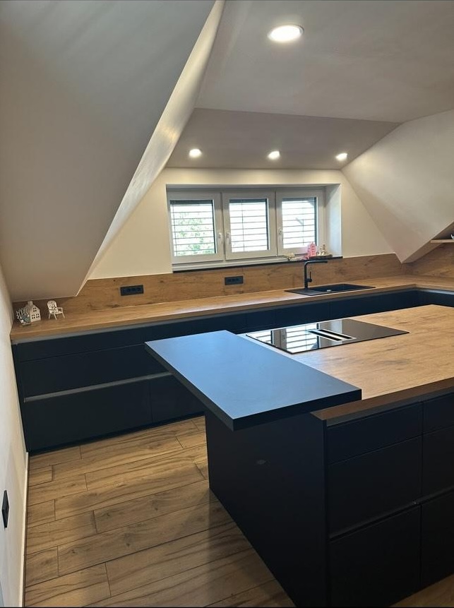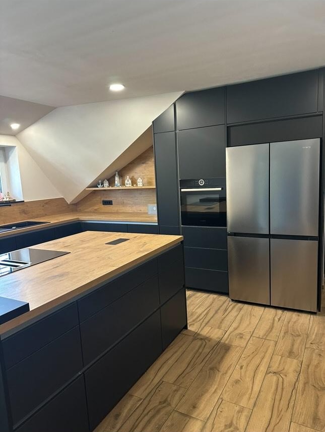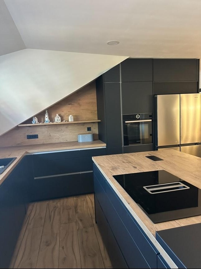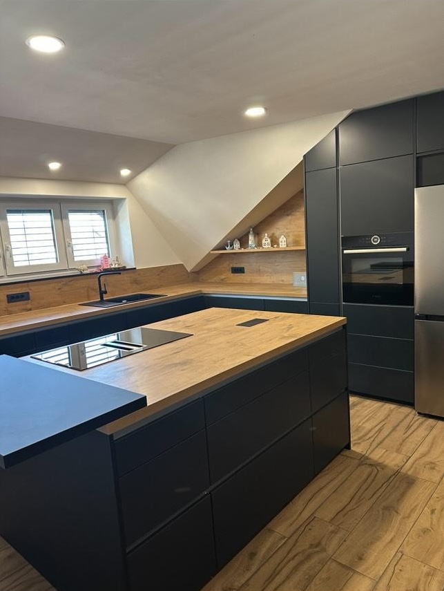 Naša strokovnost in strankine želje so pripeljale do prav posebne lepotice: kuhinja s frontami v drznem in elegantnem odtenku Anthrazit ter s policami, stensko oblogo in delovno površino v nežnem lesnem odtenku.