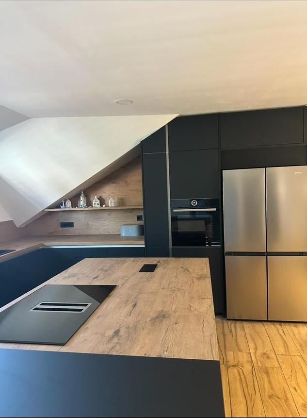 Kuhinja je prava posebnost že zaradi prostora – nahaja se namreč v mansardnem delu stanovanja, kar pa za nas ni bila ovira.
